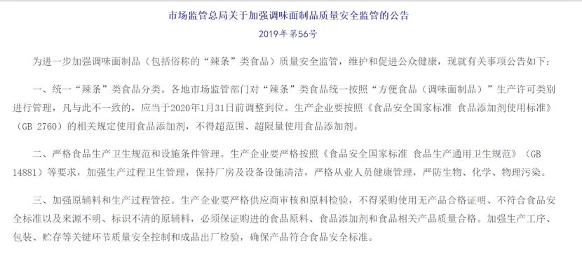 2019年12月,辣条国家标准出台,将整个行业进行规范,明确表明:统一按照“调味面制品”来界定辣条,且不得超范围、超限量使用食品添加剂,倡导辣条减盐减油减糖。