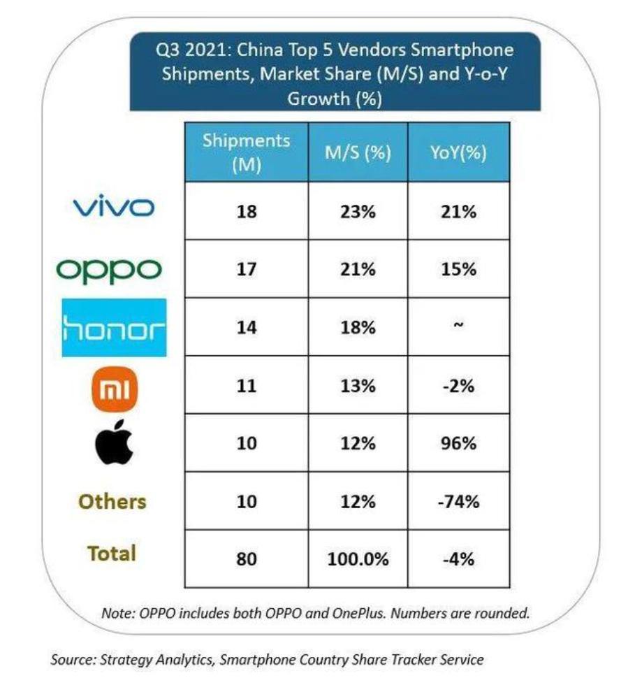 根据Strategy Analytics公布的数据显示,2021年Q3中国智能手机市场的排位是vivo、OPPO、荣耀、小米和苹果, 彼此之间差距不算太大;2021年Q4中国市场的数据还没公布,但Canalys公布的全球数据指出,苹果成为了全球销量第一的品牌,主要得益于iPhone 13系列在中国市场的热销。