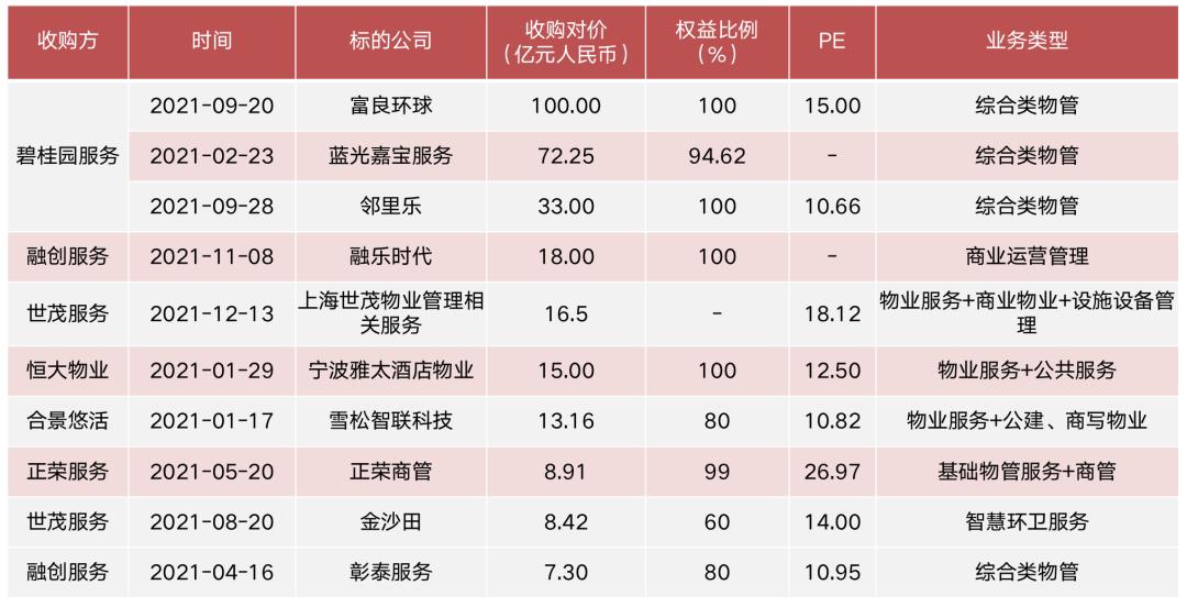 其中,超10亿元的并购达七项,前十大并购金额占年度金额超八成。截至2021年底,上市物企发起的并购事项中,有7项交易金额超过10亿元,包括:行业首例百亿并购案例——碧桂园服务不超过100亿元的代价收购富力物业,碧桂园服务最终以现金代价72.25亿元收购蓝光嘉宝服务94.62%的股权,并以33亿元收购邻里乐等。