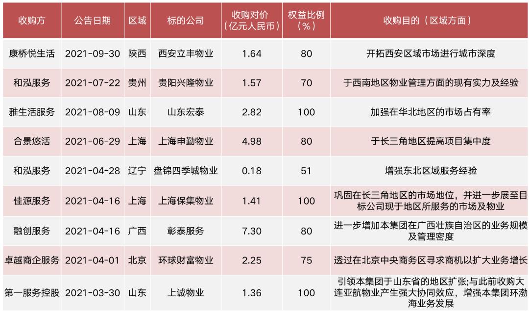 此外,物企通过并购可补强企业区域布局,推进城市深耕。2021年多家物企抓住并购的窗口期,收购区域内龙头或区域内深耕企业,实现自身在空白区域的补强,或与现有布局区域形成呼应和协同,从而加大区域深耕,增强管理密度,加大对重点区域的发力,推进全国化布局。