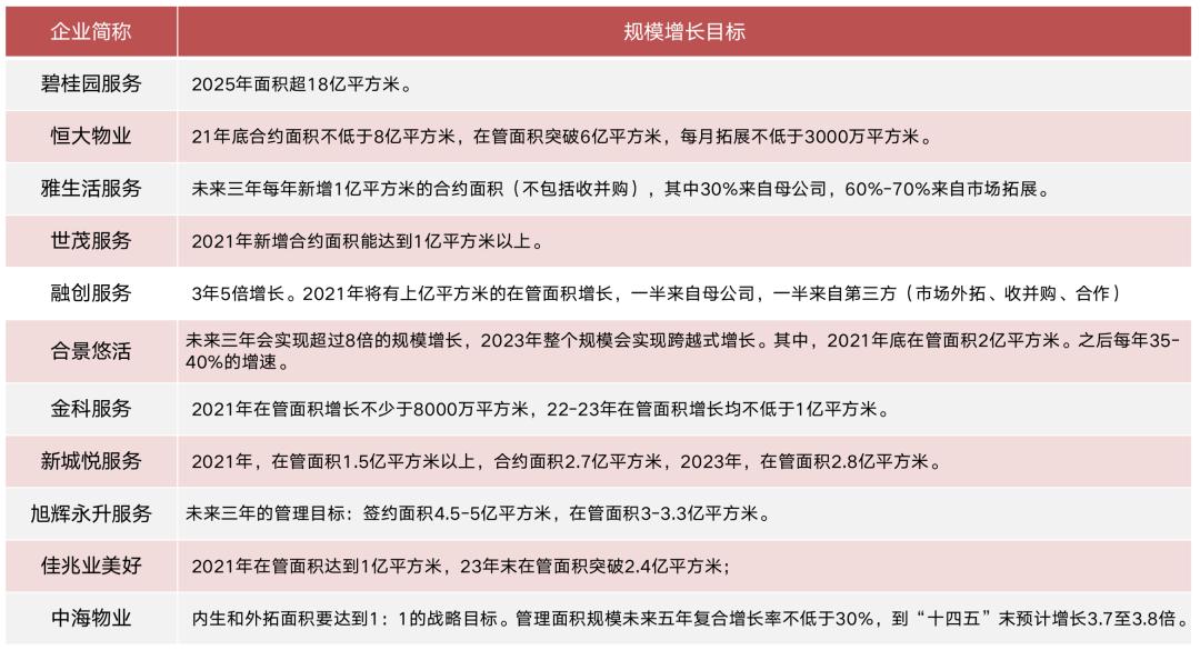 从企业端来看,迫切扩规模的需求,驱动企业发起并购。在年初,多家物企即披露了未来三至五年规模扩张目标,为全年的规模扩张提出指引。如,合景悠活在管规模3年8倍;世茂服务提出规模3年5倍;恒大物业2021年在管面积将破6亿平方米,合约面积不低于8亿平方米;碧桂园服务则表示2025年规模超18亿平方米等。