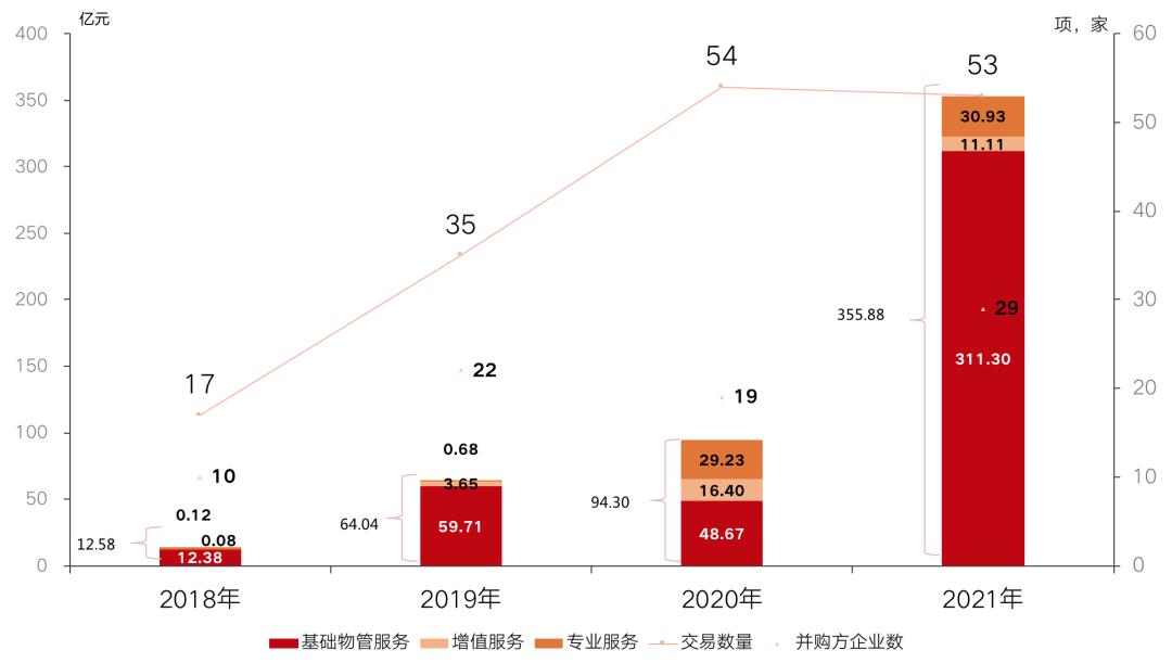 2021年,物业行业并购市场火热,据克而瑞物管和中物研协数据,截至2021年12月31日,共有29家上市物企发起53项并购,并购交易总额达355.88亿 元。