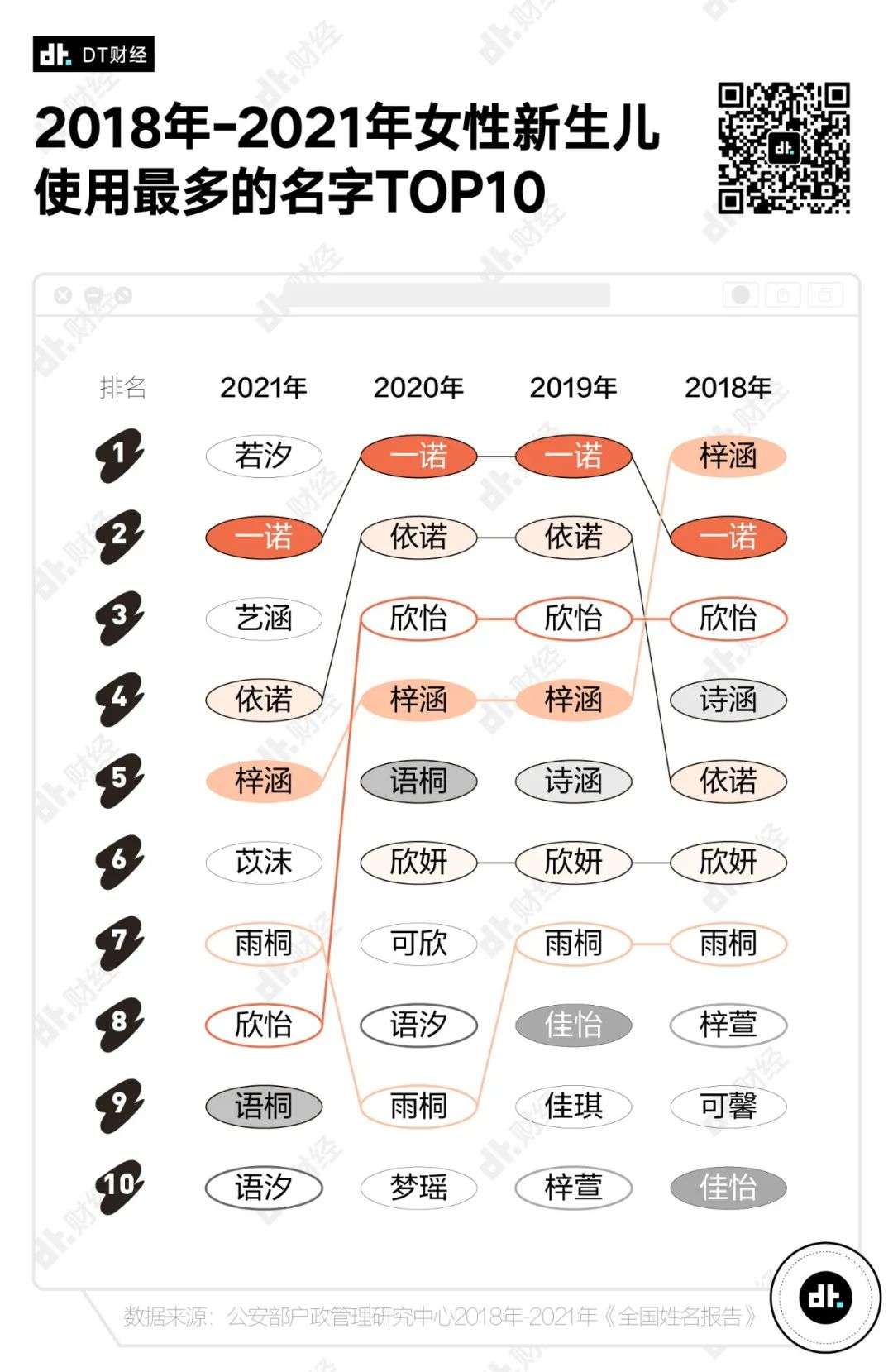 从2018到2021,最受欢迎女宝宝名字中,“一诺”“依诺”“梓涵”“雨桐”“欣怡”这5个名字,连续4年都稳坐榜单前10名。