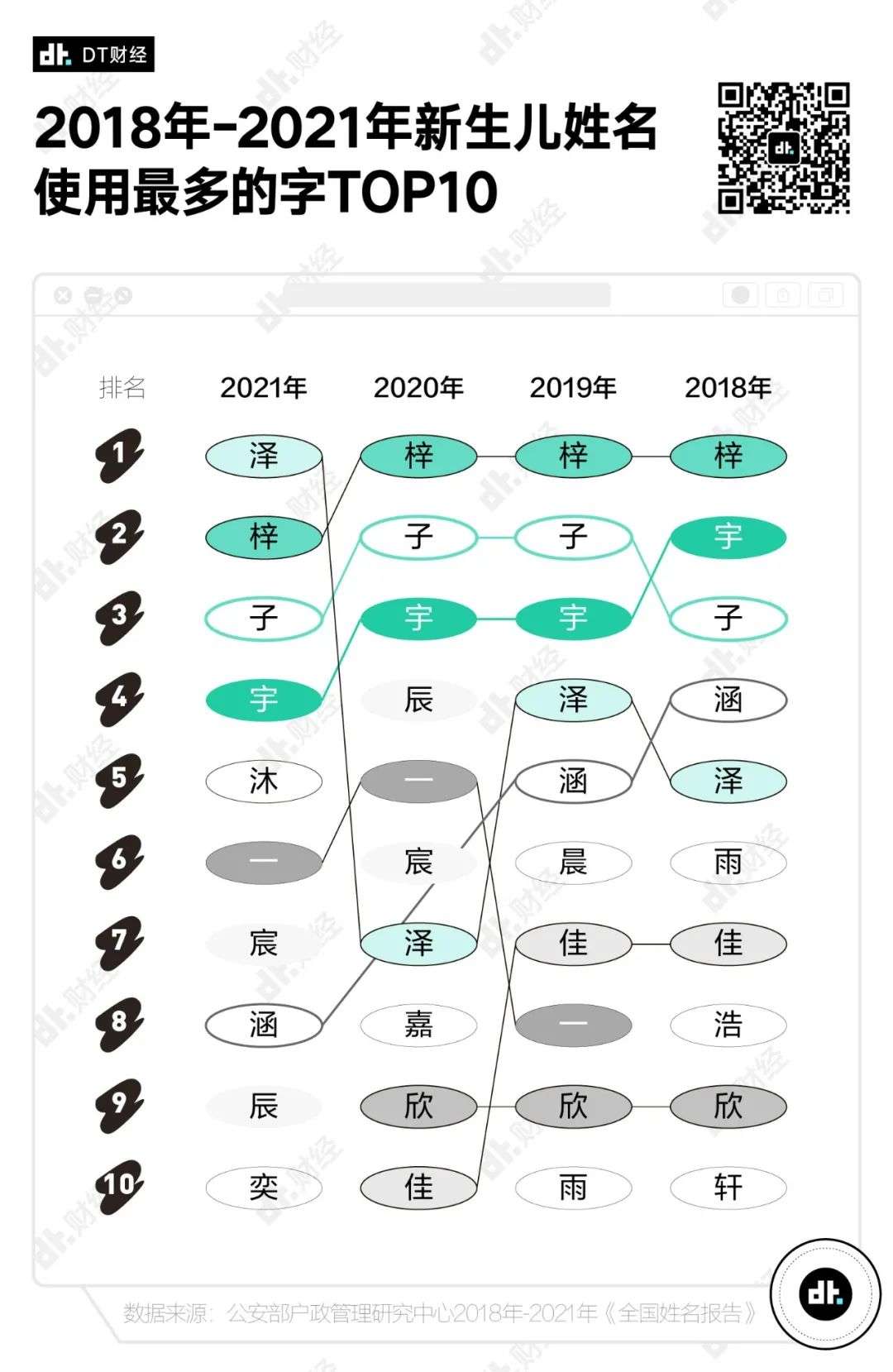 我们对比了4年的报告,发现从2018年到2021年,新生儿姓名使用频率最高的10个字中,有4个字每年都备受喜爱——分别是“泽”“梓”“子”“宇”。