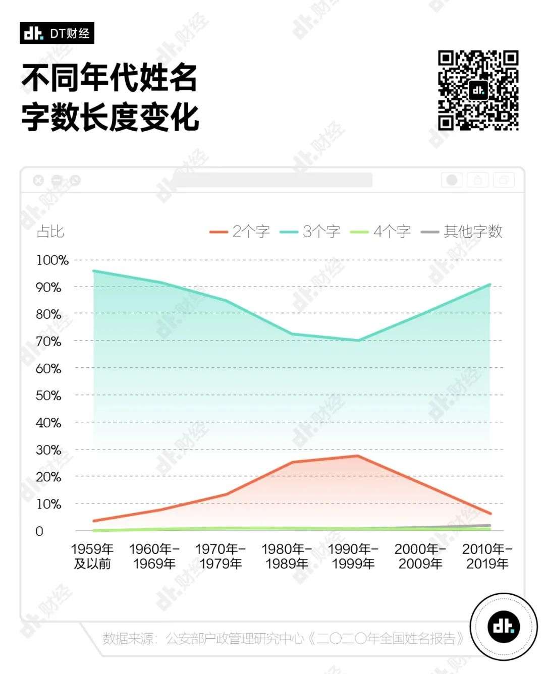 根据《二〇二〇年全国姓名报告》,目前三字姓名占比超过90%,二字姓名和四字姓名则分别占比6.3%和1.6%。