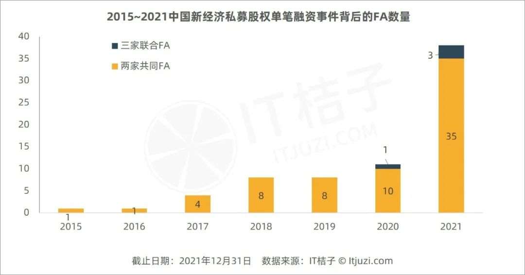 当然,从整体来看,一家 FA 机构主导一笔融资交易仍是大概率的事件。根据 IT 桔子统计,在 2021 年所有公开披露 FA 的事件中,由一家 FA 作为独家财务融资顾问的事件占比为 96.9%,比去年下降了一个百分点。