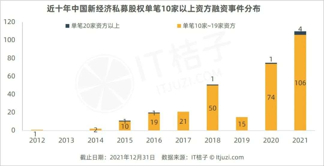 据 IT 桔子数据显示,在国内私募股权投资领域,单笔融资事件获得 10 家以上资方注资的情况正在发生剧烈的变化。2014 年以前这种现象仅是个例,当时仅有海润新媒体、中投视讯、长城证券几家出现资方聚集。2015 年后,单笔获得众多资方支持的事件开始悄然增长,达到 11 起,2016 年该数据翻倍达到 20 起。2018 年则跳跃式增长到了 51 起,2020 年则达到 75 起,到 2021 年,获得 10 家以上资方投资的事件有 110 起,是 2012 年的 100 多倍。
