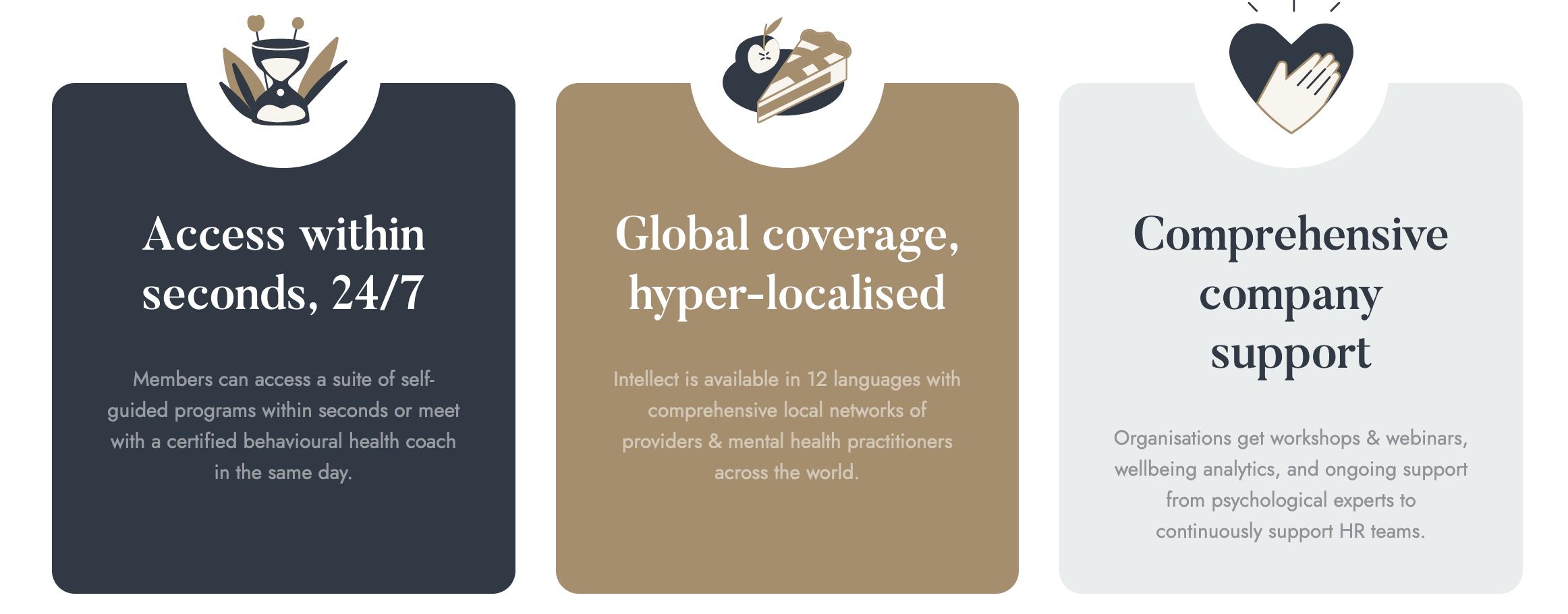 该公司联合创始人兼首席执行官西奥多里克·周(Theodoric Chew)表示,Intellect与其他员工健康项目不同,因为Intellect的愿景不只是成为一个自我保健应用程序或员工福利平台,而是为亚洲打造一个完整的精神保健系统。这推动了他们建立平台的差异化方法,其方法涵盖了从自我指导项目帮助解决微小的日常困境到慢性问题的临床治疗。