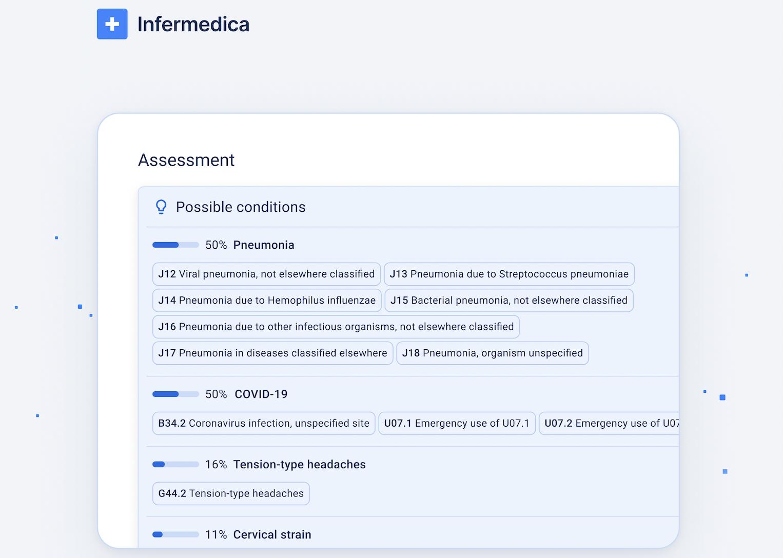 「Infermedica」提供支持线上初步诊断症状、呼叫接线员进行分诊建议的人工智能驱动软件,允许用户从头开始构建定制诊断解决方案的应用程序编程接口。与 Ada Health 和 Babylon 等竞争对手一样,「Infermedica」将医生的专业知识与自己的算法技术相结合,提供症状分类和患者建议。
