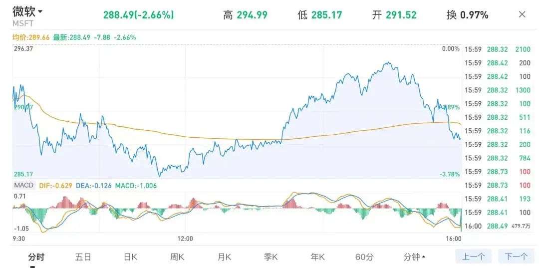 美国当地时间周二,微软股价收低2.66%,报收于每股288.49美元。截止发稿(1月26日),微软盘后跌近7%。在美股正常交易阶段,微软股价下跌2.66%,市值为2.17万亿美元。