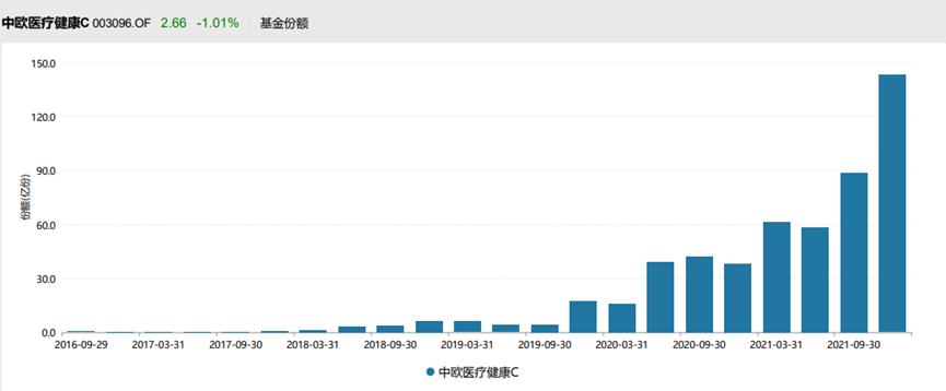 因此,从长期持有的角度来看,中欧医疗健康C份额性价比显著低于A份额。恰恰是这样一只收费方式特殊的基金,成为了C份额中的超级巨无霸。2021年四季度末数据显示,中欧医疗健康C份额的规模位列全市场C份额首位,是第二名的四倍之多。