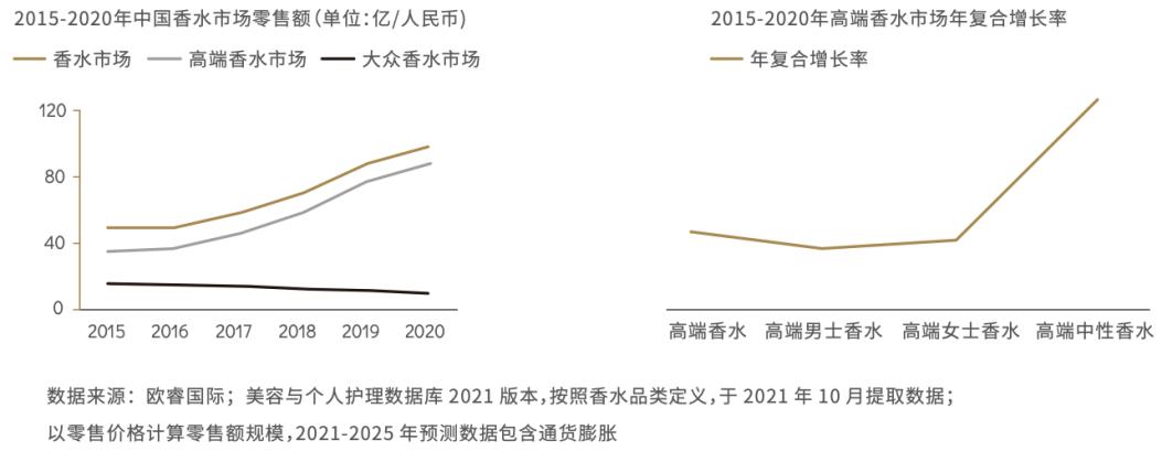 除了“高端”、“小众”,“中性”也能作为代表中国香水行业的未来发展趋势的关键词之一。根据颖通与凯度联合发布的《2021中国香水行业研究白皮书》,高端香水推动中国香水市场占比从2015年的70%提升至2020的91%,其中,“高端中性香水是年复合增长率最高的细分品类”。