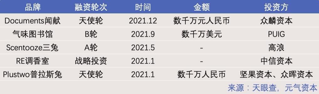 2021年,Plustwo普拉斯兔、RE调香室、Scentooze三兔、气味图书馆先后获得融资,定位高端小众市场的观夏、闻献相继开店。