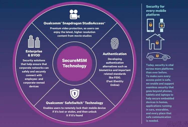首先,针对智能手机的综合安全加密需求,早在骁龙S4的时代,高通就已经在处理器中集成了Secure MSM安全技术。其包括了对早期生物识别装置、企业级安全网络连接协议、多媒体版权保护,以及手机中内容硬件加密功能等一系列安全特性。