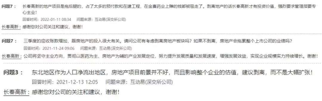 近一年来,长春高新的地产业务在深交所互动问答平台中被反复提及,且大多以建议将房地产剥离为主。