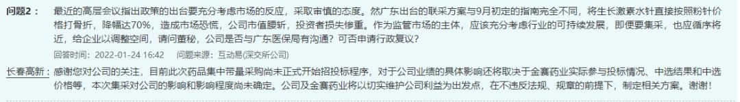 对于,1月24日,长春高新曾在投资者互动平台上回复留言时表示,目前此次药品集中带量采购尚未正式开始招投标程序,对于公司业绩的具体影响还将取决于金赛药业实际参与投标情况、中选结果和中选价格等,本次集采对公司的影响和影响程度尚未确定。