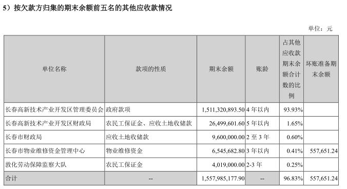 中报显示,截至2021年6月,长春高新其他应收款有15.99亿元,占总资产的比例为7.94%。其中金额最大的一笔为长春高新技术产业开发区管理委员会应收款,余额为15.11亿元,账龄在4年以内,在其他应收款项中占比93.93%。