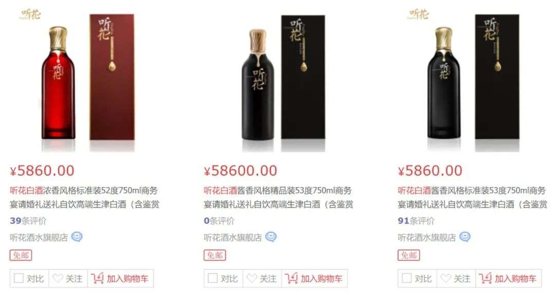 去年1月,听花酒价格维持在2199元/瓶至2599元/瓶(750毫升)价格区间,今年价格相当强势。电商平台显示,目前听花白酒价格介于5860元/瓶至58600元/瓶(750毫升)。