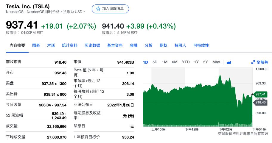 特斯拉周三在纳斯达克交易所的开盘价为952.43美元。截至周三收盘,特斯拉股价上涨19.01美元,报收于937.41美元,涨幅为2.07%。截至美国东部时间周三17:16分(北京时间周四6:16分),特斯拉股价在盘后交易中上涨3.99美元至941.40美元,涨幅为0.43%。过去52周,特斯拉股价最高为1243.49美元,最低为539.49美元。