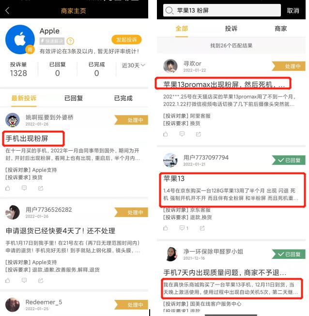 近日,有关于iPhone 13粉屏、无限重启以及主动退机等负面消息,席卷了整个网络,消费者们对于苹果手机质量及“品控”的质疑声,早已在投诉平台上蔓延开来。