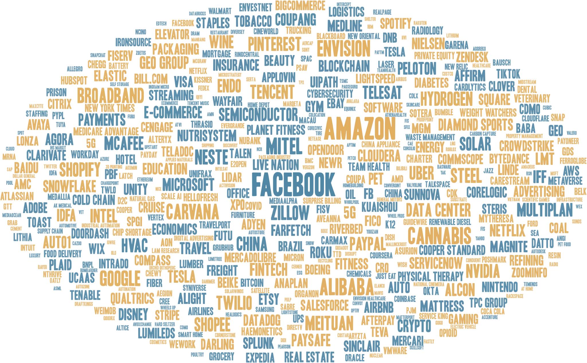 2021年,美国投资者2021年十大热词是Facebook(后改名为Meta Platforms)、亚马逊(Amazon)、大麻(Cannabis)、阿里巴巴(Alibaba)、Mitel、Envision、Carvana、谷歌(Google)、Broadband、Neste。电商巨头亚马逊(Amazon)与其他电商公司样受惠于在疫情下全球各地的封锁措施,但随着下半年各国逐步解封,市场担忧消费者会重回实体店消费,且需要面对新的供应链危机。另外,阿里巴巴(Alibaba)同样受到美国投资者的关注,与欧洲投资者的搜索高峰时间节点一致,均出现在第一季度,这说明海外投资者十分关注中国政府对互联网公司的新监管政策。