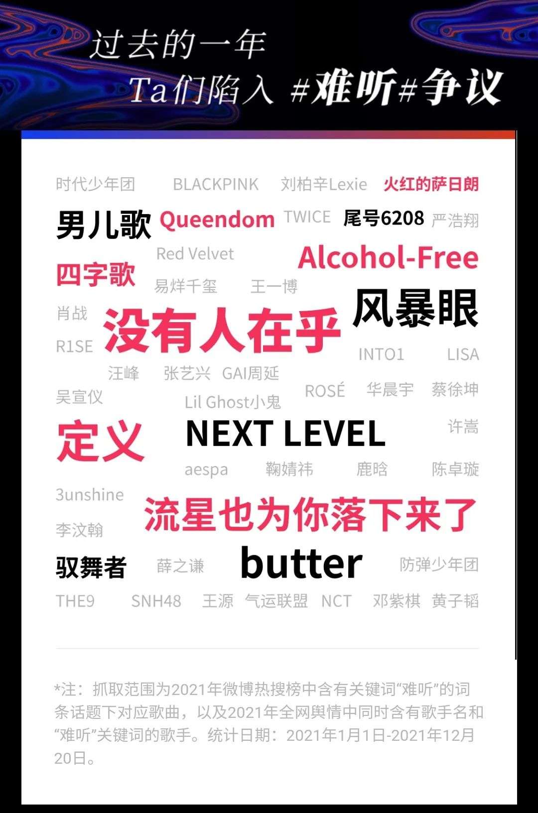 据《2021腾讯娱乐白皮书》,2021年,肖战、王一博、蔡徐坤、易烊千玺、张艺兴等“顶流”都纷纷陷入#难听#争议,在“难听”词云中榜上有名。只要他们有新歌发布,无论歌曲质量如何,#难听#两个字都会准时登上微博热搜。