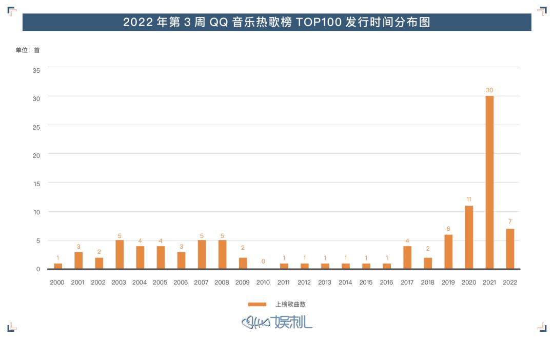 娱刺儿(ID:yuci-er)统计了2022年第3周的QQ音乐热歌榜,发现排名前10的歌曲中有4首发行时间早于2010年,前100中有39首发行时间早于2015年,如周杰伦的《晴天》、陈奕迅的《十年》、林俊杰的《江南》、蔡健雅的《红色高跟鞋》等。