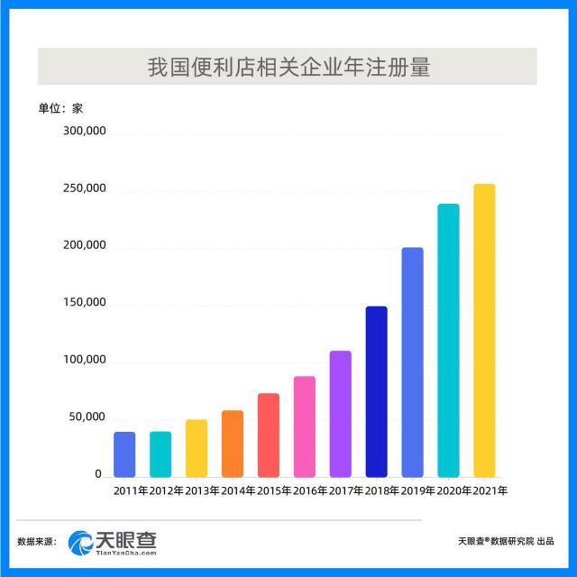 2021年,我国新增便利店相关企业超过25.7万家,较去年同比增长7.3%。而在今年,全国品牌化连锁化便利店总量将达到30万家,全国中等以上城市每百万人口不少于200家门店,连锁便利店24小时营业门店的比例不低于30%(含无人零售店)。