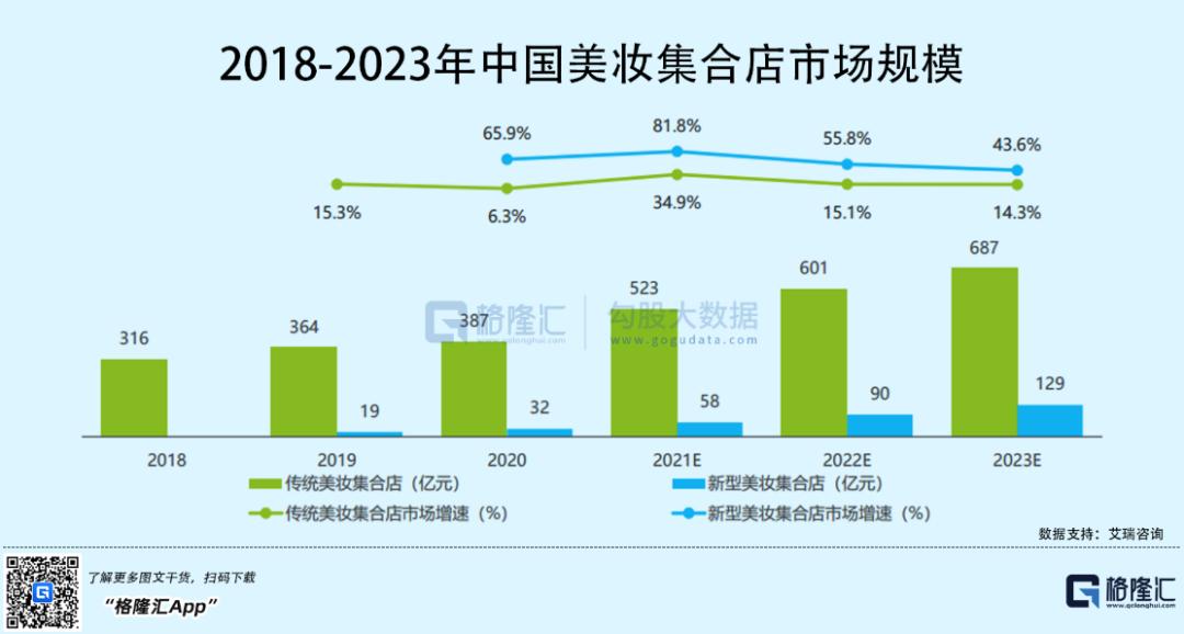 《中国美妆集合店行业报告》显示,2020年国内新型美妆集合店占整体美妆集合店市场规模的7.6%,预计2023年有望达到15.8%,市场规模预期近130亿元。