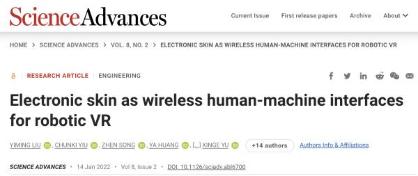 将电子皮肤作为无线人机系统应用到机器人VR中的研究项目由此启动。