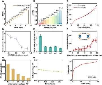 研究结果表明,影响电子皮肤无线传输距离的因素有:顶部肤色弹性硅封装层厚度,人体中复杂的生物组织可能吸收电磁辐射等。