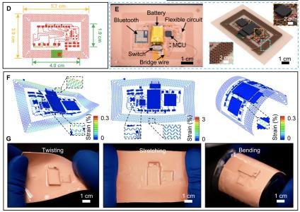电子皮肤中的设计均根据完善的力学设计规则成丝状蛇形结构,从而使整个系统具有可拉伸性。另一层肤色弹性硅(PDMS)用来封装所有功能组件。