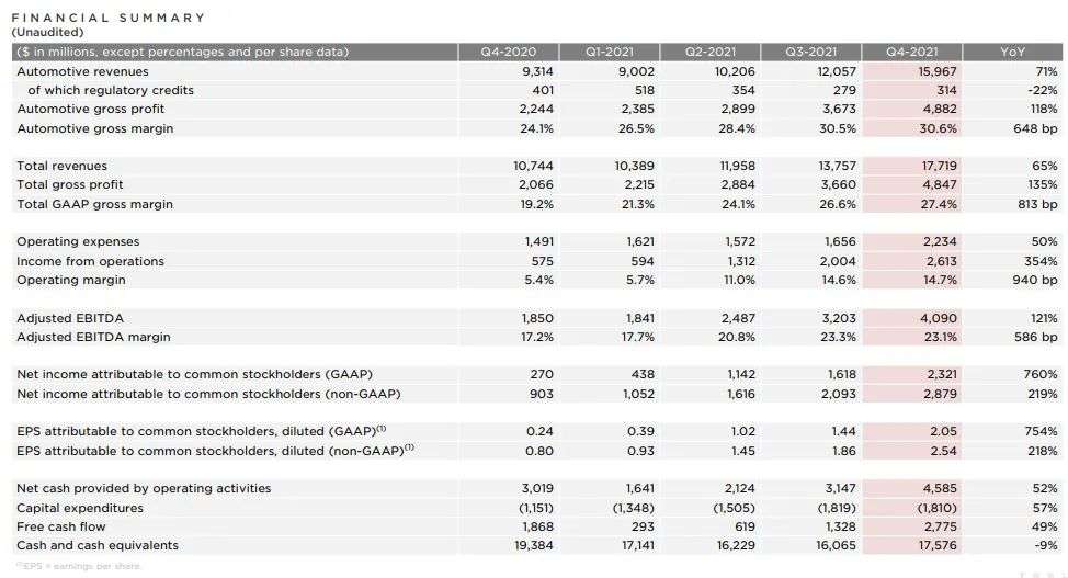 官方数据显示,特斯拉2021年第四季度新车交付量为30.86万辆,打破了之前的单季度销售纪录。在2021年第四季度支付了2.45亿美元以兑现2018年CEO股权激励后,公司营业利润率依然接近15%。财报显示,与2020年同期相比,特斯拉2021年第四季度营业利润增加至26亿美元,营业利润率达到14.7%。截至2021年第四季度,特斯拉已实现连续10个季度盈利。