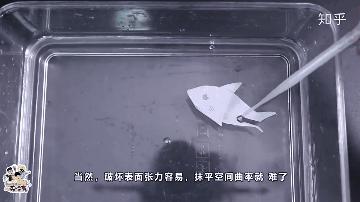 在网上众多关于《三体》的讨论中,有这样一则视频,制作者从小区里常见的水黾切入,谈了谈水的张力,然后通过将洗洁精滴在曲别针表面、小纸船和小纸鲨鱼后面的小小实验,严谨解释了《三体》中曲率驱动的知识点。