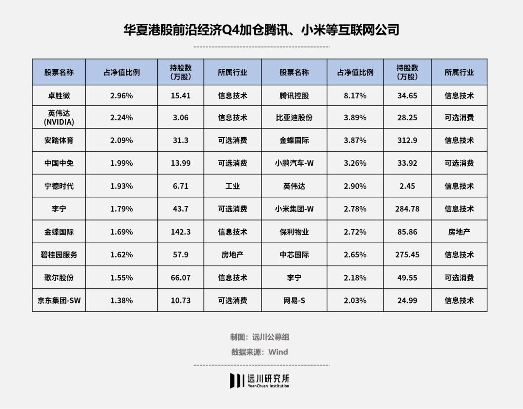 公开资料显示,由她和屠环宇合管的港股基金华夏港股前沿经济四季度大幅增加了港股的配置,腾讯控股跃居第一大重仓股,小米集团、网易等公司进入前十大重仓行列。