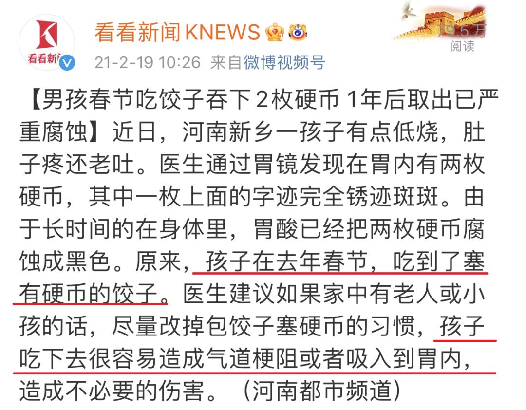 寓意是好的,但这一习俗也受到了质疑。硬币作为流通的货币,包在饺子里是否干净卫生?要是不小心咬到,硌了牙怎么办?不小心咽下去,岂不是更危险?