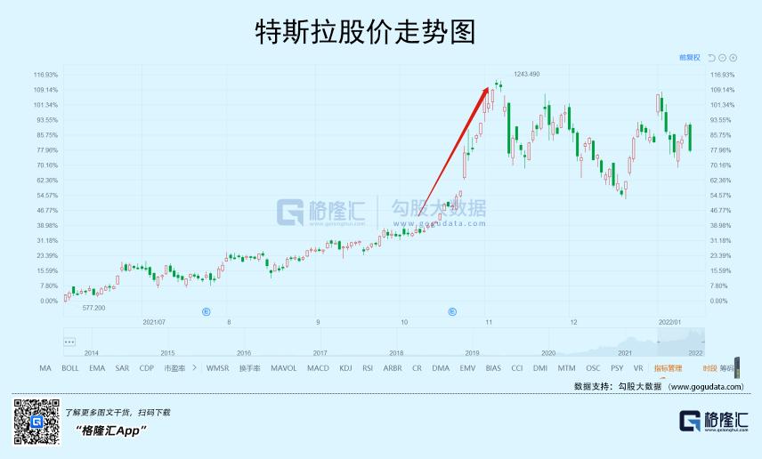 特斯拉去年国庆后有过一波大涨,股价直接从700多美元扶摇直上,很快冲上1200元的位置,涨幅高达50%,其后因为马斯克卖股票交税的事情回调,但新年后又再次冲上1200美元的位置。