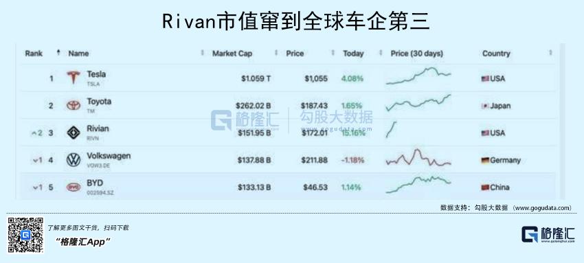 实事求是地讲,这两年新能源汽车的炒作实在太疯狂,特斯拉一年涨了7倍,一堆亏损连连,出货量比传统车企零头不到的新势力,市值却完全吊打传统车企,要说疯狂,还真不止中国,老美也一样,Rivian,一辆车没卖,上市后没多久,市值就窜到全球车企第三位,仅次于特斯拉和丰田。