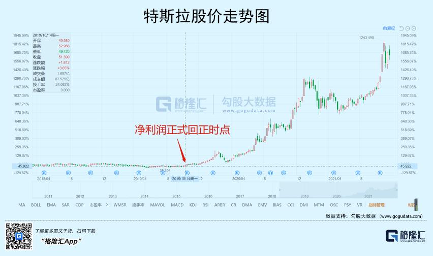 同样的事情在特斯拉身上也发生过,它的季度净利润从2019年三季度正式回正,并一直延续至今,我们再用时间轴对比一下股价走势,很明显,开始盈利是一个非常强的推动股价上涨的因素。