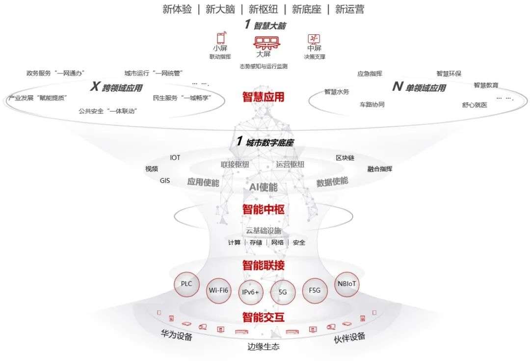 城市智能体包括四个层面:智能交互,包含华为和伙伴的边端设备,它们就像“五官”和“手脚”,全面感知城市中的人、物、空间和过程,并与它们实时交互;智能联接,包括5G、F5G、Wi-Fi6、IoT等技术,就像“躯干”和“神经”,让数据得以高速汇聚,城市体征得以实时感知,智能与执行得以快速抵达现场,激活城市的创新潜力;智能中枢,包括云基础设施、AI使能、应用使能和数据使能,是真正的中枢,让AI发挥关键作用,全网协同,基于城市数据及时发现问题、研判趋势、预防风险并作出恰当反应;智慧应用,由政府与华为等企业进行协同创新,实现ICT技术与行业知识的深度融合,重构体验、优化流程、使能创新,逐步形成三大领域智慧应用体系,包括数字政府、数字经济、数字生活。