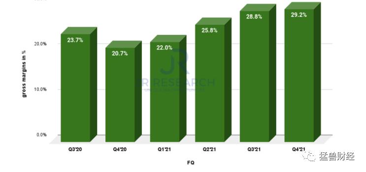 从上图中我们可以看到特斯拉的毛利率一直在提高,而且在全球供应链紧张和芯片短缺给汽车行业造成了沉重的打击的情况下,特斯拉的这些数据还在增长。有很多人可能觉得特斯拉的交付增长和利润率增长是理所当然的事,其实并不是,如果你回顾一下2021年全世界的汽车行业都受到了冲击,而且世界上最主要的几家汽车厂商都报告了令人失望的交付业绩时,就不这么想了。