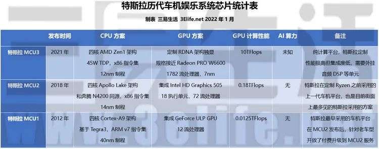当然,大家都知道,在2021年底特斯拉再次升级了他们旗下车型的车载娱乐系统。而此次的MCU3基于定制AMD锐龙处理器和一块性能达到了PS5级别的RDNA2架构独立显卡,使得目前的新款车型在车载娱乐系统算力上相比上代产品又提升了超过50倍之多,一跃成为当前车载娱乐系统中的最强性能水准。
