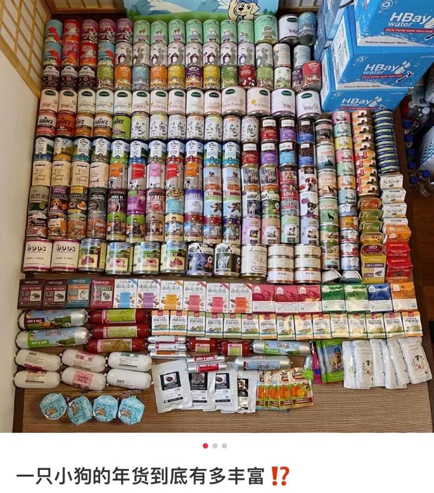 春节前大促密集,成为了铲屎官们囤货的好时机。在分享社交平台上,很多猫家长会将囤来的猫狗粮、宠物罐头、宠物零食等一一排列整齐,形成宏大的视觉冲击,对于铲屎官来说,晒宠物罐头与晒口红和包包本质上并无区别,“这些都是流量源泉”。
