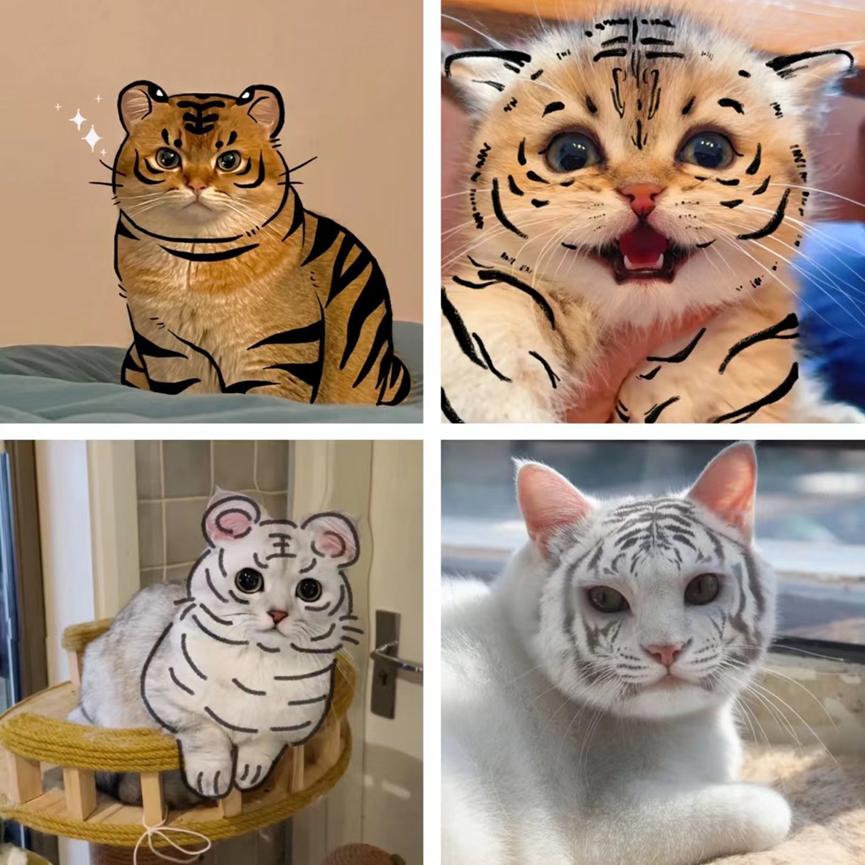 在分享平台小红书上,铲屎官们还为自家的小猫咪进行二创,金渐层勾勒几条老虎花纹,就成了一只栩栩如生的东北虎,银渐层勾勒几条老虎花纹,就成了一只凶猛的孟加拉大白虎。