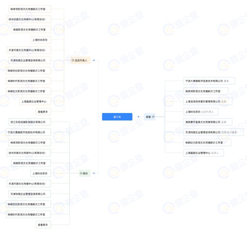 从工商信息看,杨颖虽仅有3家企业,但其工作室多由董文英注册,爱企查显示,董文英共有18家企业,在14家企业中担任法定代表人,包含杨颖时代影视文化传播新沂工作室、杨颖世纪影视文化传播新沂工作室、杨颖影视文化传播新沂工作室等。