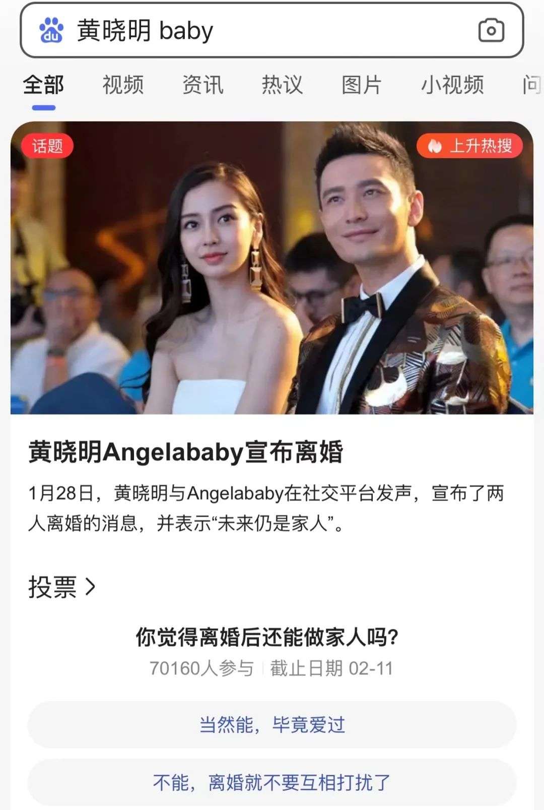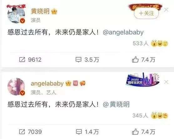 在新年到来前的最后一个周五,黄晓明和angelababy(原名杨颖,后文baby、angelababy皆为同一人)于今日午间正式官宣离婚,有网友评论,在这场各有所求的婚姻里,双方得到了彼此想要的东西后最终选择和平分手,并体面地表示,“未来仍是家人。”