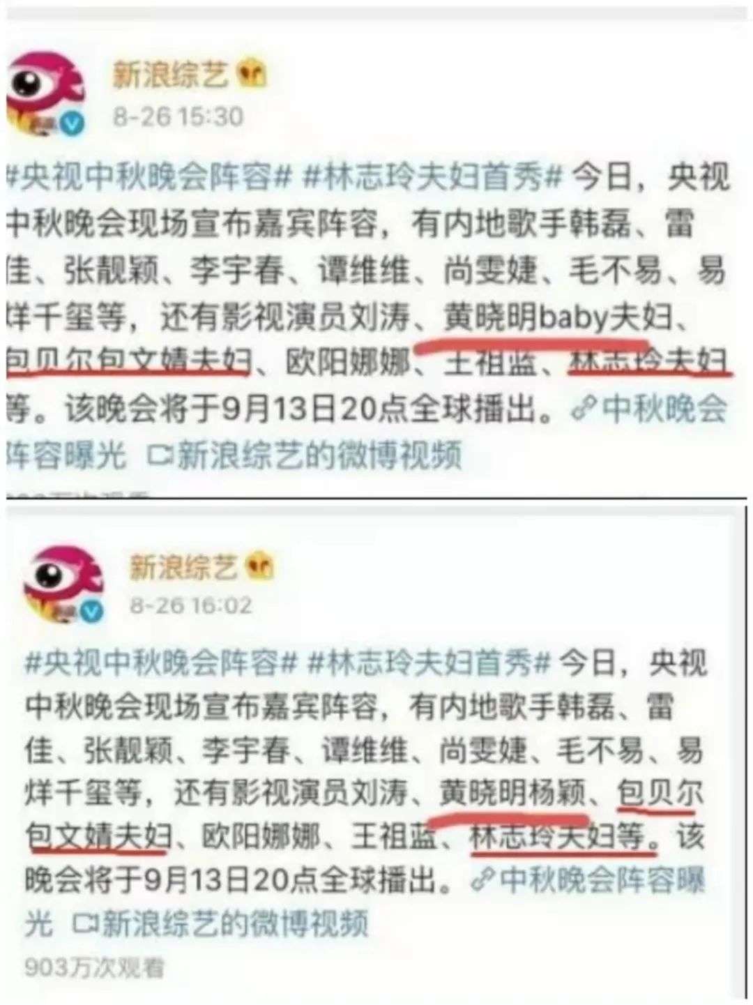 2019年8月,央视中秋晚会在宣布出席的明星名单时,谈及二人,最初为黄晓明baby夫妇,后又更改为黄晓明杨颖,而其他的如包贝尔、包文婧,林志玲后依然跟着夫妇字样。这一举动也被外界视为“央视盖章”。当时,有媒体向黄晓明方求证,黄晓明方工作人员表示“真的没有”“希望媒体和网友不要再胡乱猜测了”。