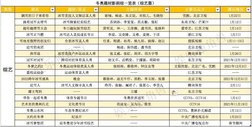 6天!北京冬奥会正在进入倒计时,社交平台上大众注意力也牢牢被赛程、音乐短片等各种信息吸引着。文娱市场的反应还要更快一些,2022年伊始,以冬奥题材为主的电影、电视剧和综艺就以全面开花的姿态,跑步进入“冬奥时间”。