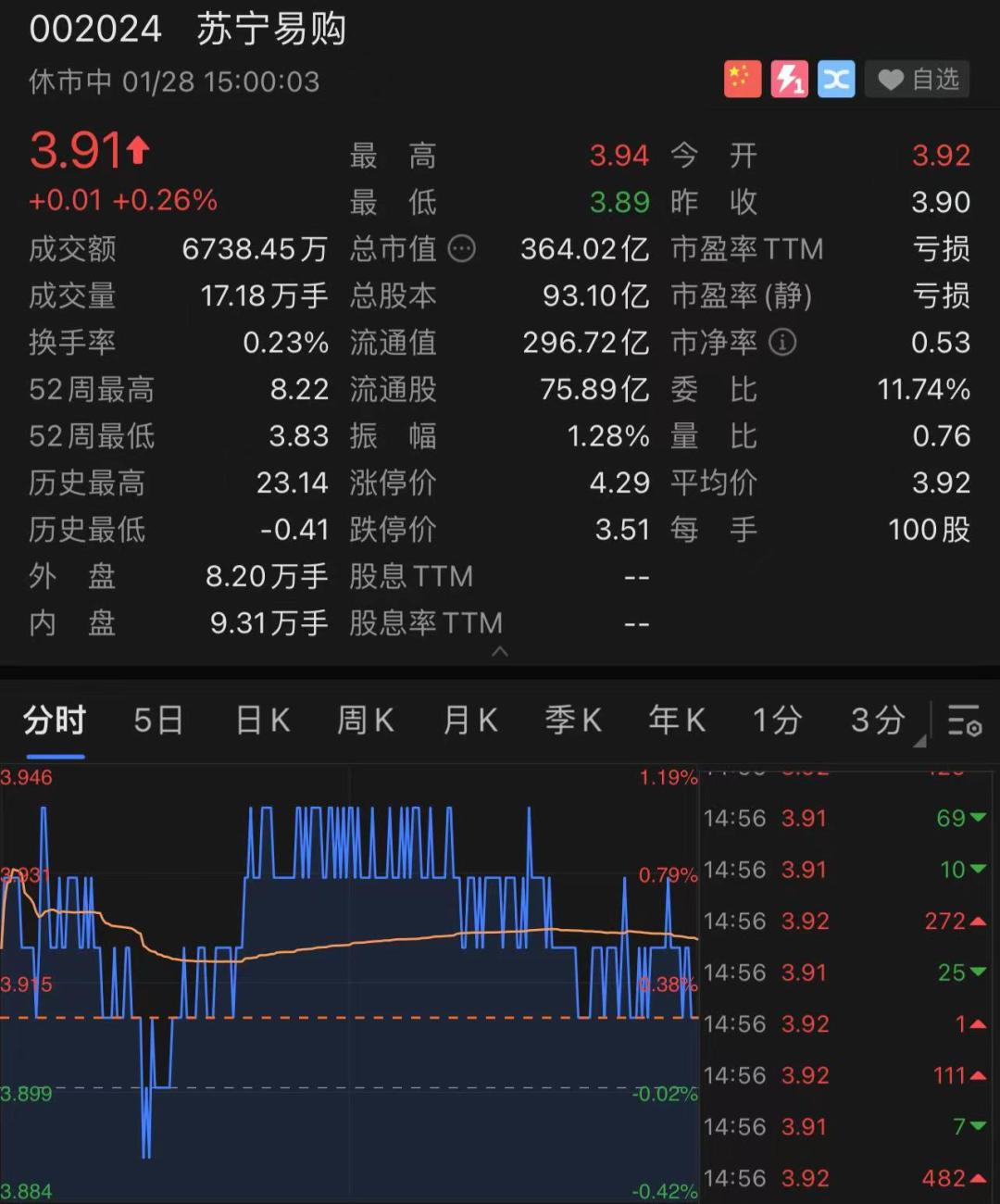公告称,2021年公司在完成11月月度EBITDA转正的阶段性目标之后,在不考虑非经营性现金流相关的因素影响下,公司预计2022年一季度EBITDA转正。截至1月28日收盘,苏宁易购报3.91元,涨幅0.26%。
