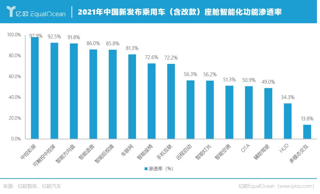 根据亿欧智库调研,2021年中国新发布乘用车(含改款)座舱功能渗透率中,HUD渗透率为34.3%。